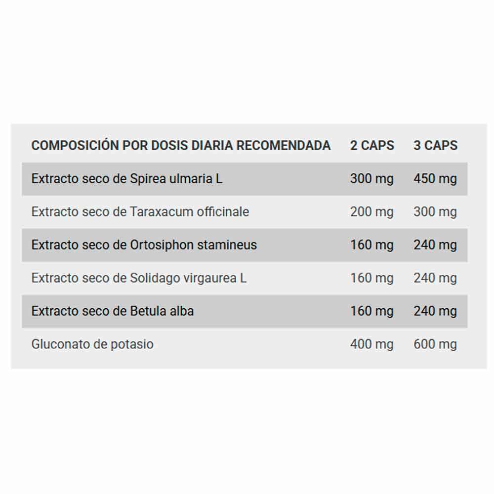 Ingredientes: Agente de carga (Gluconato potásico), Extracto seco de Ulmaria (Spiraea ulmariaL., floresy hojas, 0.2% ácido salicílico),Cápsula (Agente de recubrimiento (hidroxipropilmetilcelulosa),colorante(E-170)),Extracto seco de Diente de león (Taraxacum officinale(L.) Weber ex F.H.Wigg., raíz, 2% inulina),Extracto seco de Ortosifón (Orthosiphon stamineusBenth, hojas, 0.1% sinensetina, 15:1), Extracto secode Vara de oro (Solidago virgaureaL., sumidades floridas, 1.2% esencias flavonicas, 10:1), Extracto secode Abedul (Betula pendulaRoth, hojas, 3.5% flavonoides),Antiaglomerantes (Sales magnésicas de ácidosgrasosy dióxido de silicio).