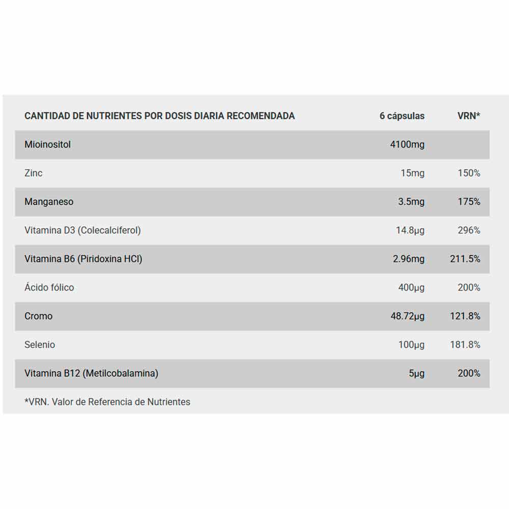 Ingredientes: Mioinositol, cápsula (agente de recubrimiento (hidroxipropilmetilcelulosa)), agente de carga (celulosa microcristalina), emulgente (sales magnésicas de ácidos grasos), picolinato de zinc, citrato de manganeso, colecalciferol (vitamina D3), clorhidrato de piridoxina (Vitamina B6), Ácido (6S)-5-metiltetrahidrofólico, sal de glucosamina (folato), picolinato de cromo, selenito de sodio, metilcobalamina (vitamina B12).