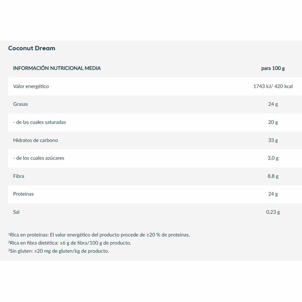 Humectantes (maltitoles, glicerina), cobertura de cacao [edulcorantes (maltitoles), aceites vegetales totalmente hidrogenados (coco, colza), cacao en polvo bajo en grasa, emulgentes (lecitinas)] 15%, coco rallado 15%, concentrado de proteínas de suero de leche, fructo-oligosacáridos, concentrado de proteínas de leche, colágeno hidrolizado, aceite de coco totalmente refinado, aislado de proteínas de suero de leche instantáneo {aislado de proteína de suero de leche, emulgente [lecitinas (soja)]}, agua, harina de almendra, emulgente [lecitinas (soja)], gelificante (carragenina), aromas, conservante (sorbato de potasio), estabilizante (cloruro de potasio), antioxidante (alfa-tocoferol), edulcorante (sucralosa).
