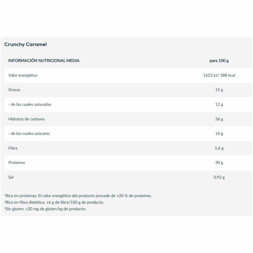 - Crunchy Caramel Dulces trocitos de caramelo envueltos en cobertura blanca: suaves e irresistiblemente crujientes. Una barrita que a la vez te mima y te aporta energía: rica en proteínas y en fibra para que disfrutes de tu pasión por el caramelo como una experiencia verdaderamente placentera.