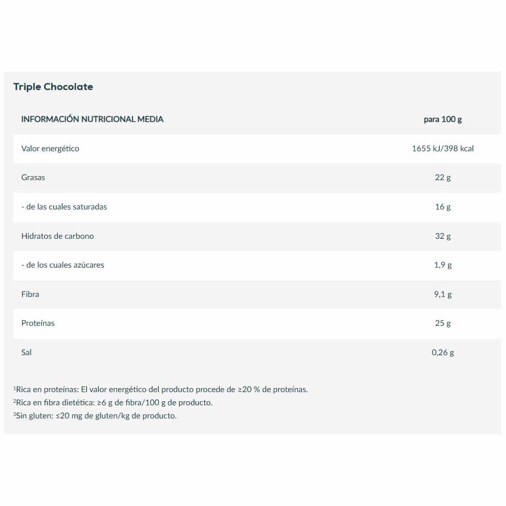 - Triple Chocolate Chocolate rico y cremoso que se derrite con crujientes trocitos de haba de cacao en una sola barrita: ¡el sueño de cualquier amante del chocolate! En cada bocado te espera una avalancha intensa y dulce de chocolate, como si probaras un postre celestial, rindiendo homenaje al amor por el chocolate en cada gota; además, es rico en proteínas para que disfrutes del paraíso del chocolate sin remordimientos.
