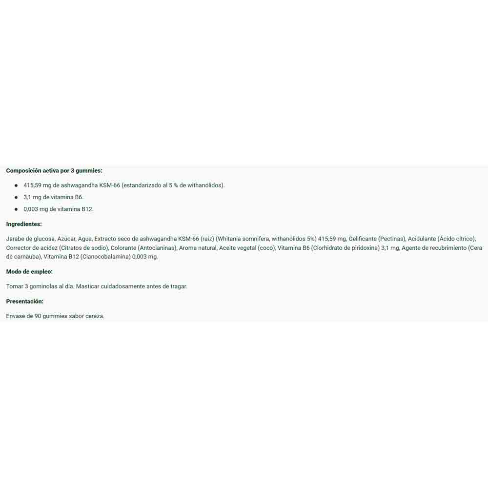 Jarabe de glucosa , Azúcar , Agua , Extracto seco de ashwagandha KSM-66(raíz) ( Whitania somnifera, withanólidos 5%)415,59 mg, Gelificante(Pectinas), Acidulante(Ácido cítrico), Corrector de acidez(Citratos de sodio), Colorante(Antocianinas), Aroma natural , Aceite vegetal (coco) , Vitamina B6(Clorhidrato de piridoxina)3,1 mg, Agente de recubrimiento(Cera de carnauba), Vitamina B12(Cianocobalamina)0,003 mg