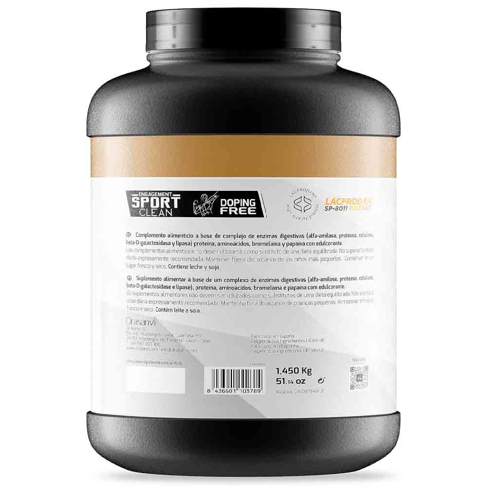 Whey Protein con es un complemento alimenticio a base de proteínas de alta pureza. Esta fuente proteica proviene de concentrado de suero de leche .La calidad de nuestra proteína nos permite obtener un producto de alta concentración en proteínas (próximo al 80%), bajo en hidratos de carbono y de grasas. Su alta pureza aporta gran cantidad de aminoácidos ramificados, presentes naturalmente en la proteína, así como otros aminoácidos esenciales y minerales como el calcio y el fósforo. Con el fin de mejorar la calidad del producto, hemos añadido aminoácidos como la Glutamina y la Leucina. También hemos añadido enzimas digestivas para mejorar su asimilación. Además de esporas para mejorar la microbiota.