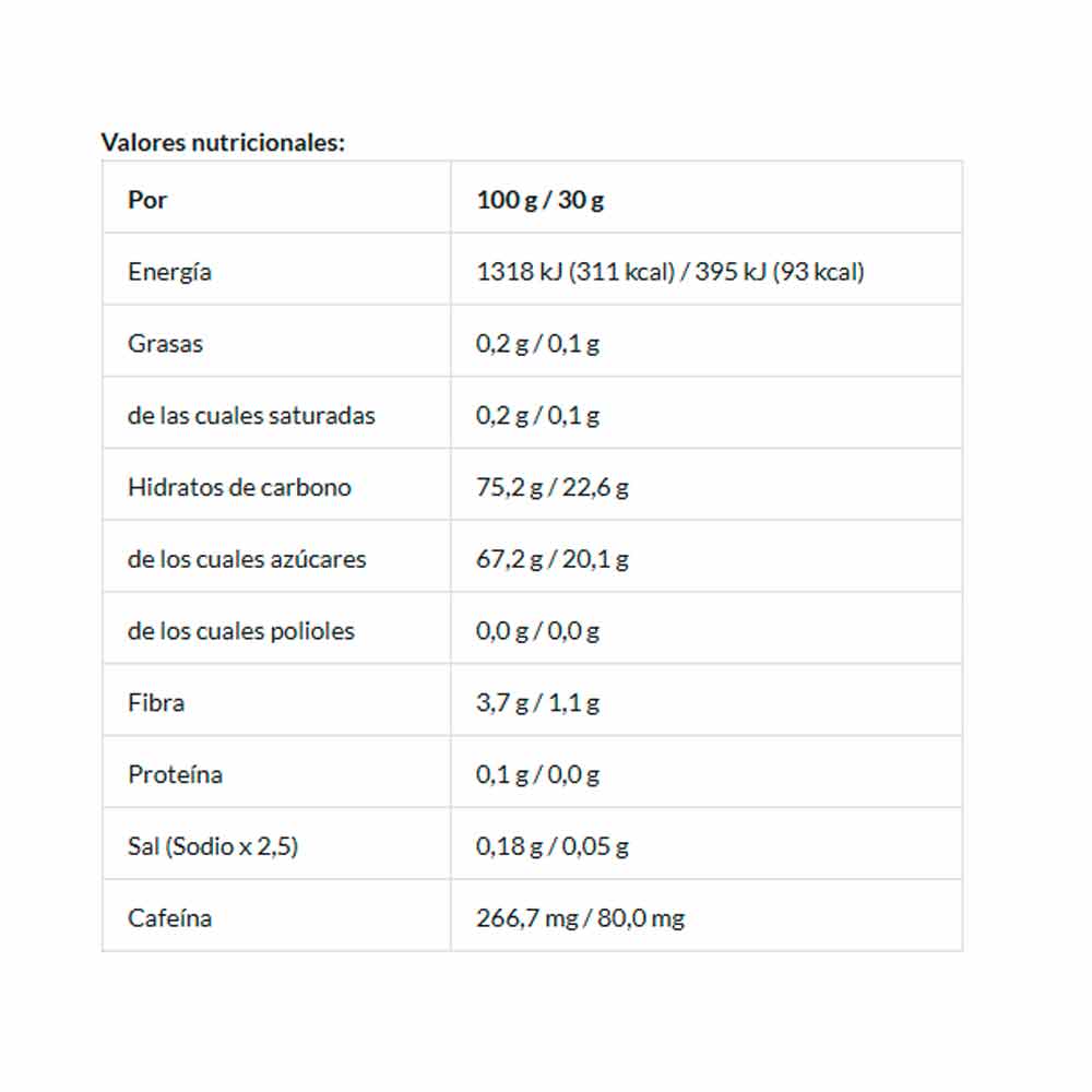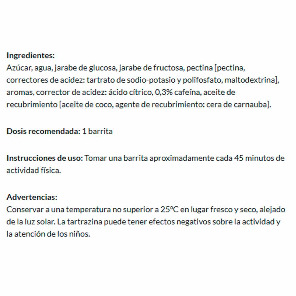 Azúcar, agua, jarabe de glucosa, jarabe de fructosa, pectina [pectina, correctores de acidez: tartrato de sodio-potasio y polifosfato, maltodextrina], aromas, corrector de acidez: ácido cítrico, 0,3% cafeína, aceite de recubrimiento [aceite de coco, agente de recubrimiento: cera de carnauba].