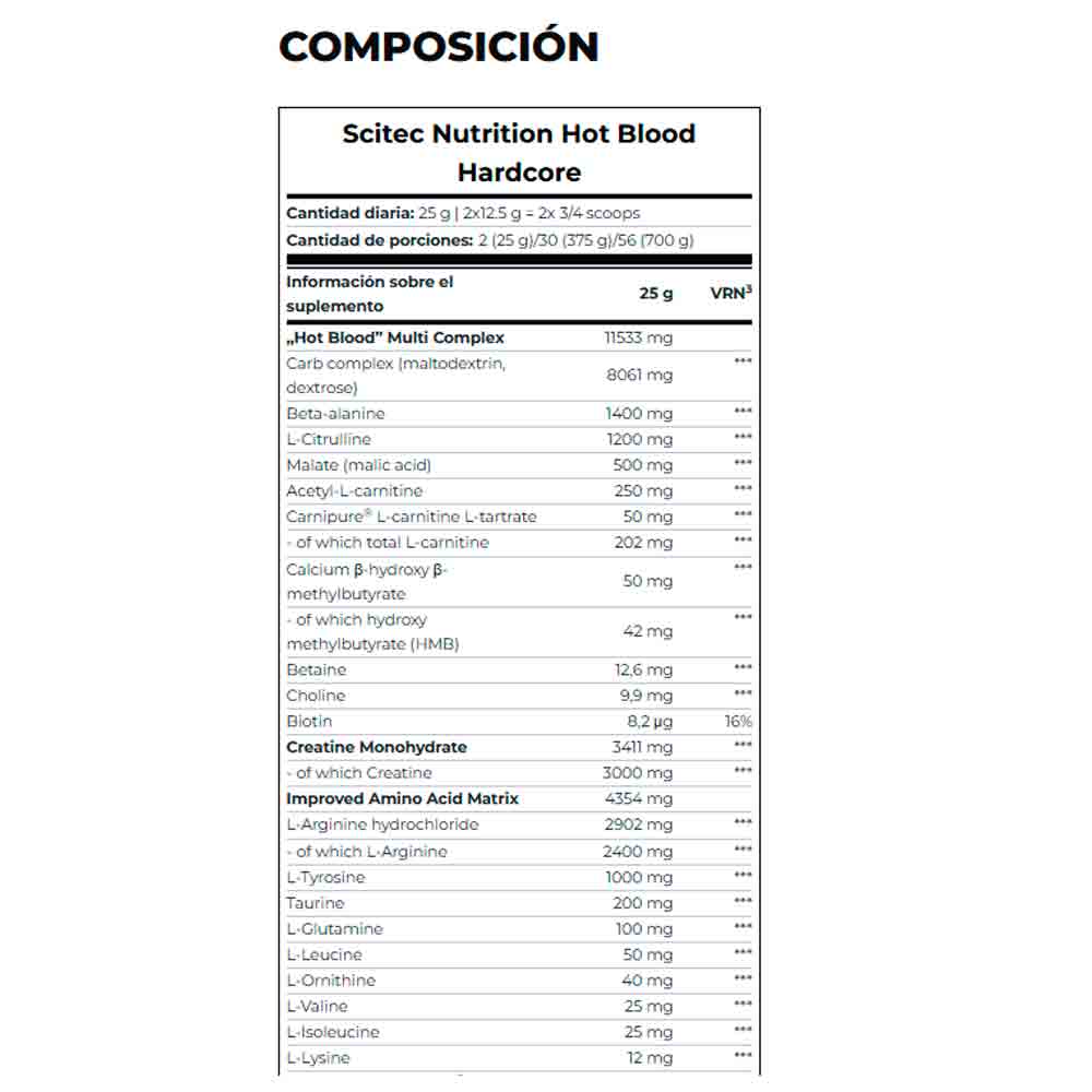 - CON MONOHIDRATO DE CREATINA: La creatina presente en HOT BLOOD HARDCORE mejora el rendimiento físico durante breves ráfagas de ejercicio de alta intensidad. El efecto beneficioso se consigue con una ingesta diaria de 3 g de creatina.