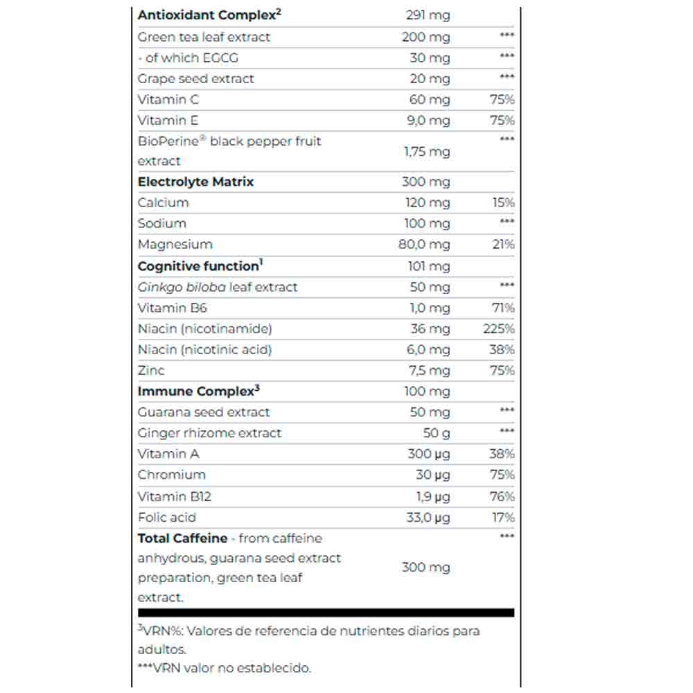 - INGREDIENTES ADICIONALES: 300 mg de cafeína de múltiples fuentes, extracto de pimienta negra (bioperine), con aminoácidos y electrolitos.