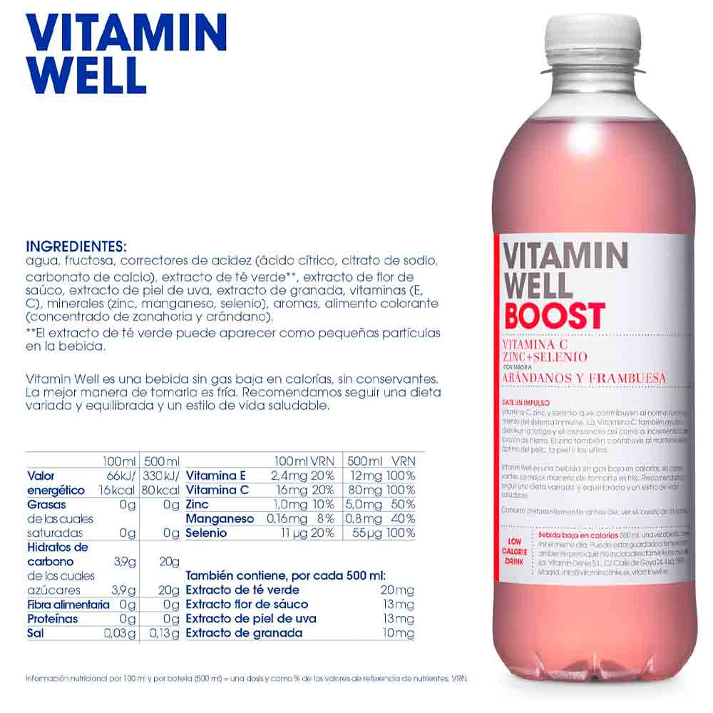 Vitamin Well Boost es una bebida baja en calorías enriquecida con vitaminas y minerales, y sabor a arándano/frambuesa
