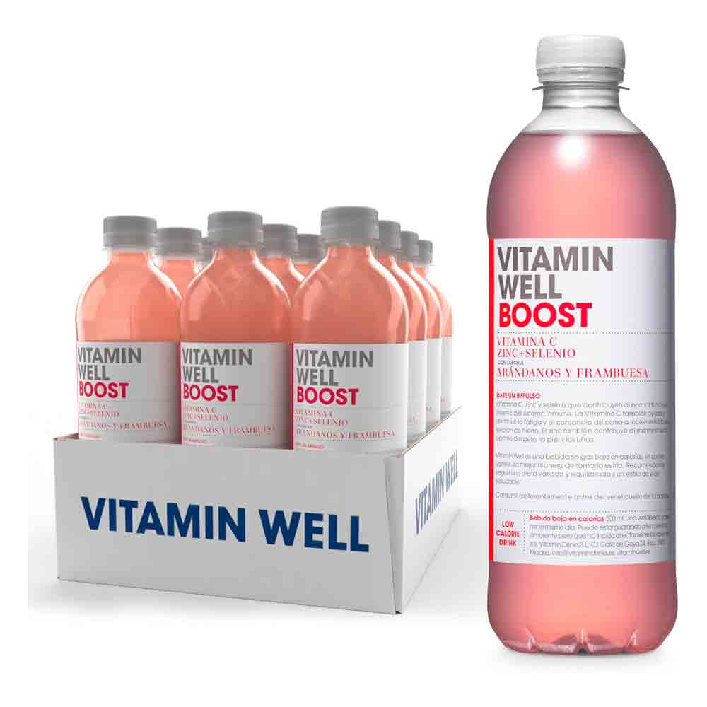 Vitamin Well Boost es una bebida baja en calorías enriquecida con vitaminas y minerales, y sabor a arándano/frambuesa