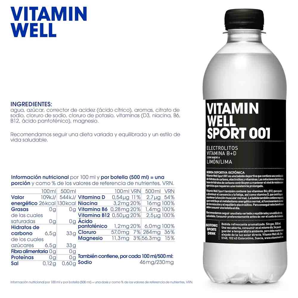 Vitamin Well Sport contiene vitaminas B6 y B12, que ayudan a reducir el cansancio y la fatiga, y vitamina D, que contribuye a mantener el funcionamiento normal de los músculos. La bebida también contiene magnesio, que contribuye al metabolismo energético normal del organismo y al funcionamiento normal de los músculos, así como al equilibrio electrolítico. Recomendamos una dieta variada y equilibrada y un estilo de vida saludable.