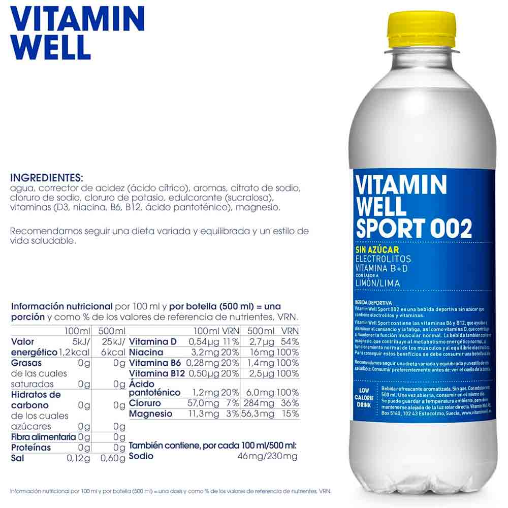 Vitamin Well Sport 002 es una bebida deportiva sin azúcar que contiene una combinación de electrolitos y está enriquecida con vitaminas y minerales.