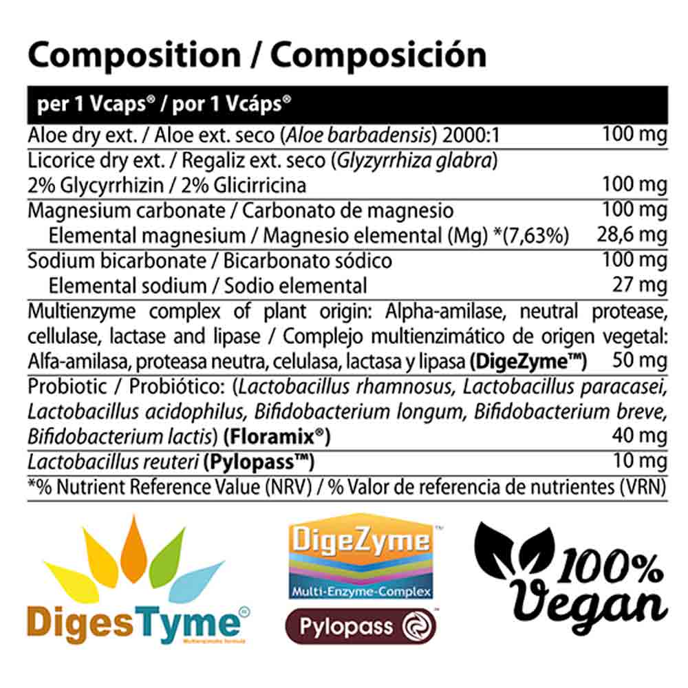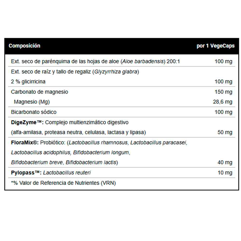 Ingredientes: extracto seco de parénquima de las hojas de aloe (Aloe barbadensis), extractode raíz y tallo de regaliz (Glyzyrrhiza glabra), carbonato de magnesio, bicarbonato sódico, espesante (cápsula): hidroxipropilmetilcelulosa, DigeZyme: complejo multienzimático digestivo (alpha-amilasa, proteasa, celulasa, lactasa y lipasa), Floramix: probiótico (Lactobacillus rhamnosus, Lactobacillus paracasei, Lactobacillus acidophilus, Bifidobacterium longum, Bifidobacterium breve, Bifidobacterium lactis), Pylopass: Lactobacillus reuteri, antiaglomerantes: estearato de magnesio y dióxido de silicio.